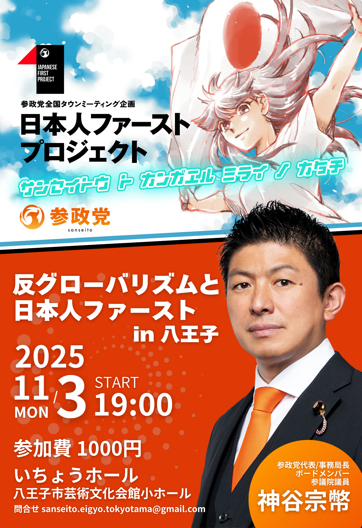 このプロジェクトの一環として、急遽、八王子市にて参政党代表/参議院議員の神谷宗幣によるタウンミーティング開催が決定いたしました。